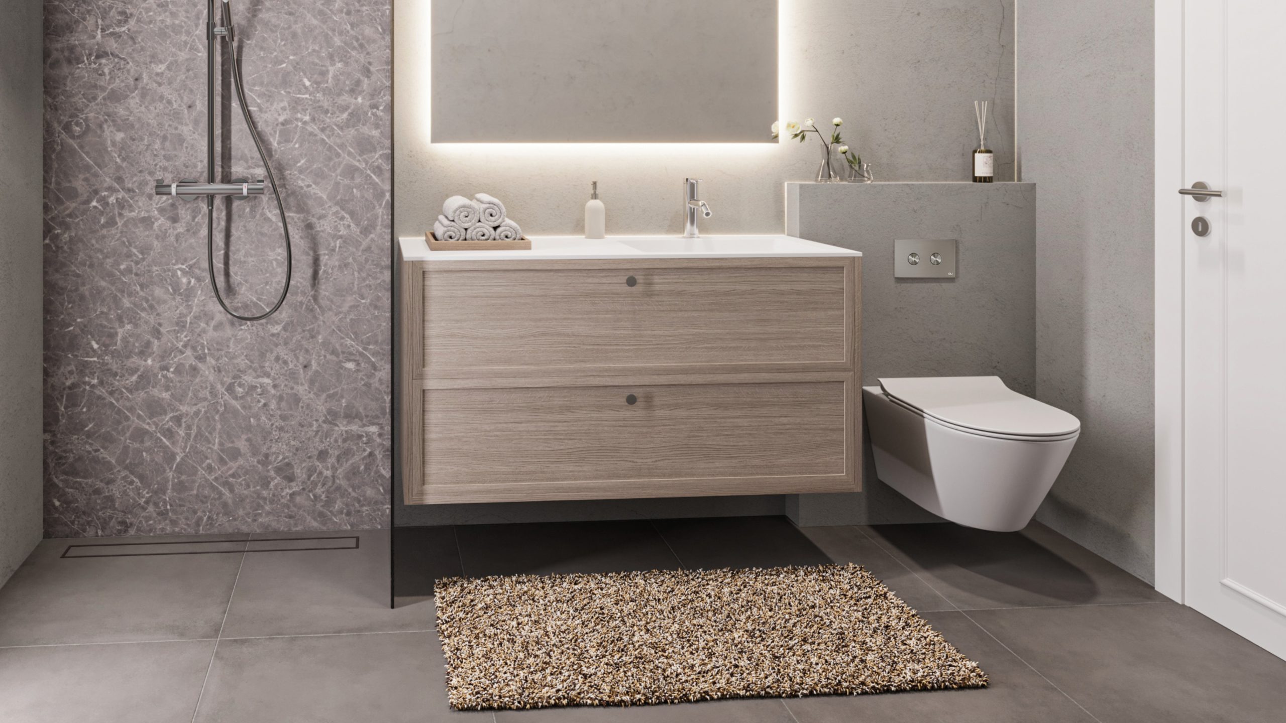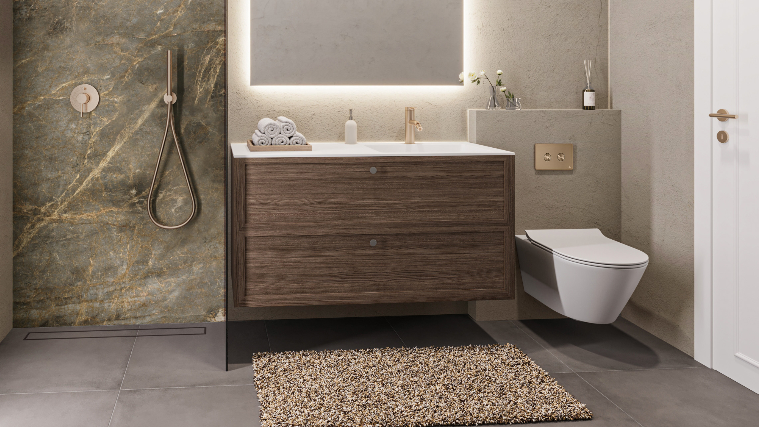 Vannitubades kohtuvad efektne suurformaadiline keraamika ja pehmed valguslahendused, millele lisavad karakterit harjatud pronksi detailid. See kooslus loob interjööri, mis mõjub väärikalt ja modernselt üheaegselt.